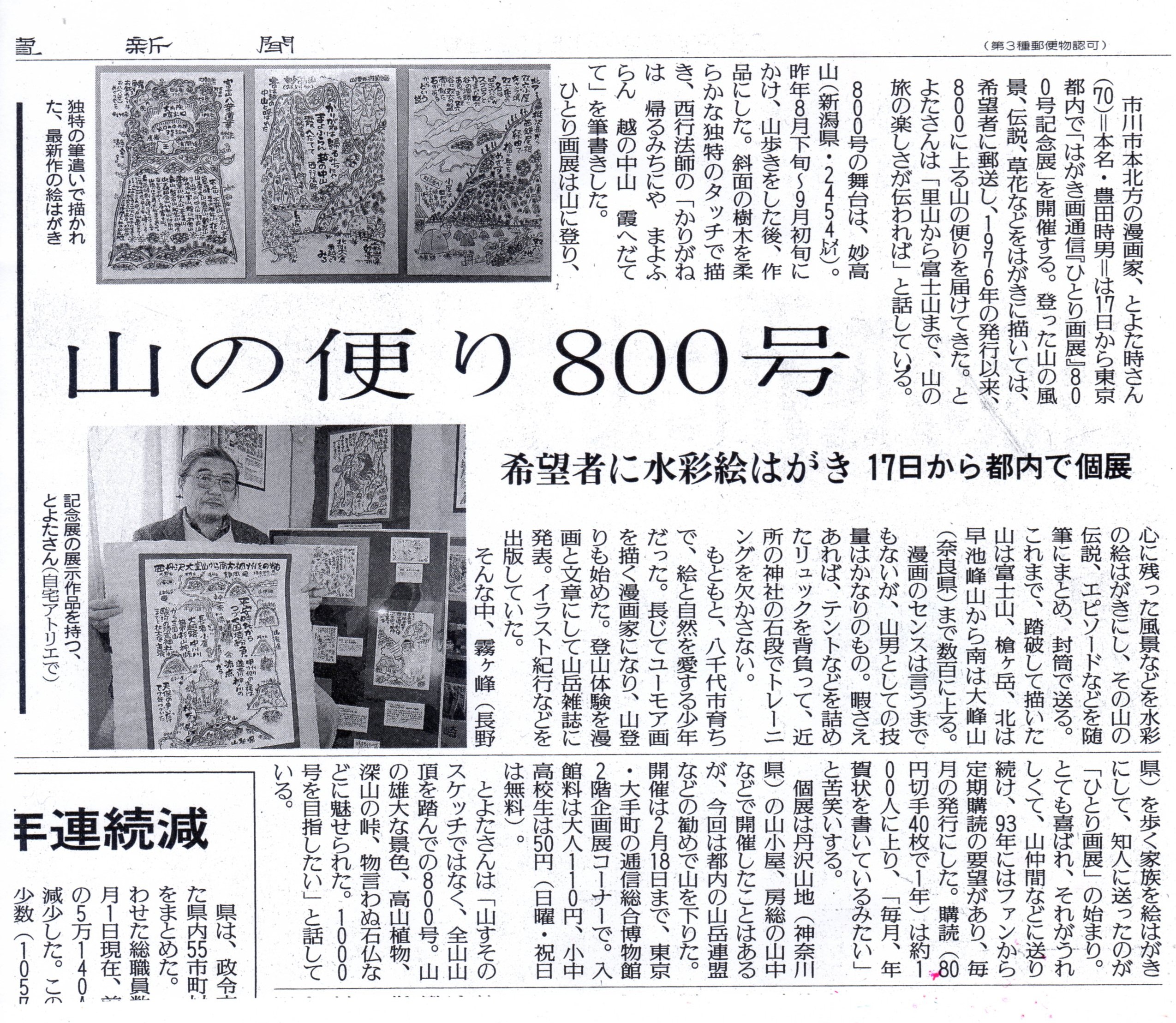 | ★上記【山のひとり画展】のはがき画(解説文つき)を毎月郵送しています。 ・ご希望の方には4000円で、毎月1年間、新作はがきをお送りしています。 (82円切手53枚でも可)。ほかにバックナンバー(5号分ずつ)の通信を同封し ます。このページ右下方の住所までどうぞ。 金融機関から4千円お振り込みの場合は下記郵便振替か銀行へお願いします。 ・郵便振替口座:00130-5-355576(時・ゆ-もぁ-と) ・京葉銀行北方支店(153):普通口座3040081、名義とよた時 ★上記【山のひとり画通信】【バックナンバー】のはがき絵(上記一覧表) ・10枚セットで1200円(切手可)(送料・税とも)でお譲りしています。 (右下宛にどうぞ) ★上記【山のひとり画通信】をCD-Rにまとめてあります。 各巻とも1200円(送料・税とも)でお譲りしています。 ・第1巻「001〜200号」 ・第2巻「201〜400号」 ・第3巻「401〜600号」 ・第4巻「601〜800号」 ・第5巻「801〜1000号」現在進行中 |