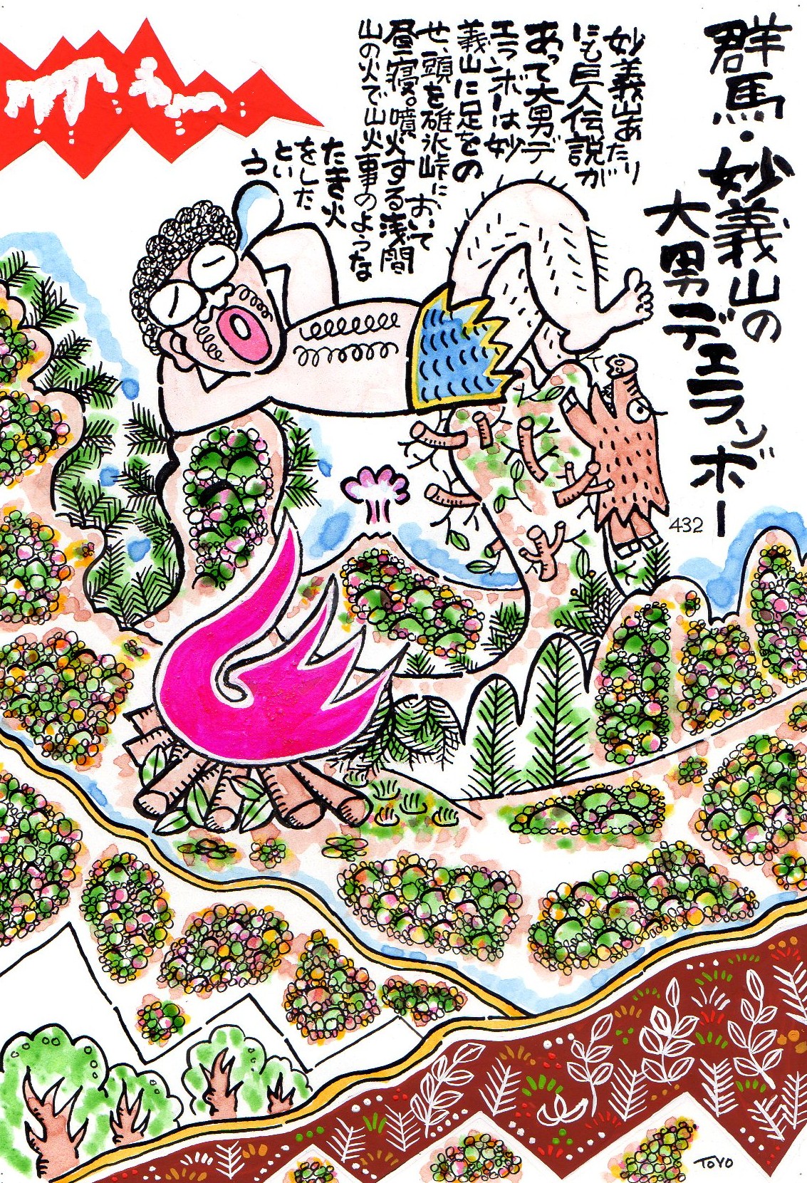 という。妙義山に足を乗せて昼寝していると、イノシシどもが大男