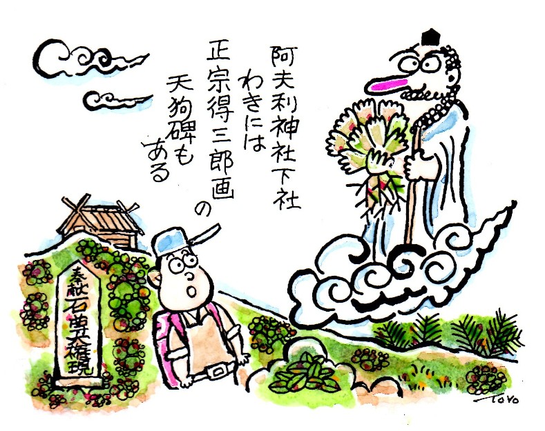 和33)正宗得三郎描いた絵をもとにして彫った伯耆坊天狗像の碑