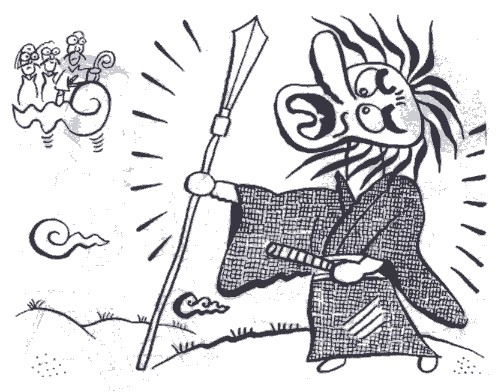 し、錫杖(しゃくじょう)という杖を持ち、一本歯の高げたをはい