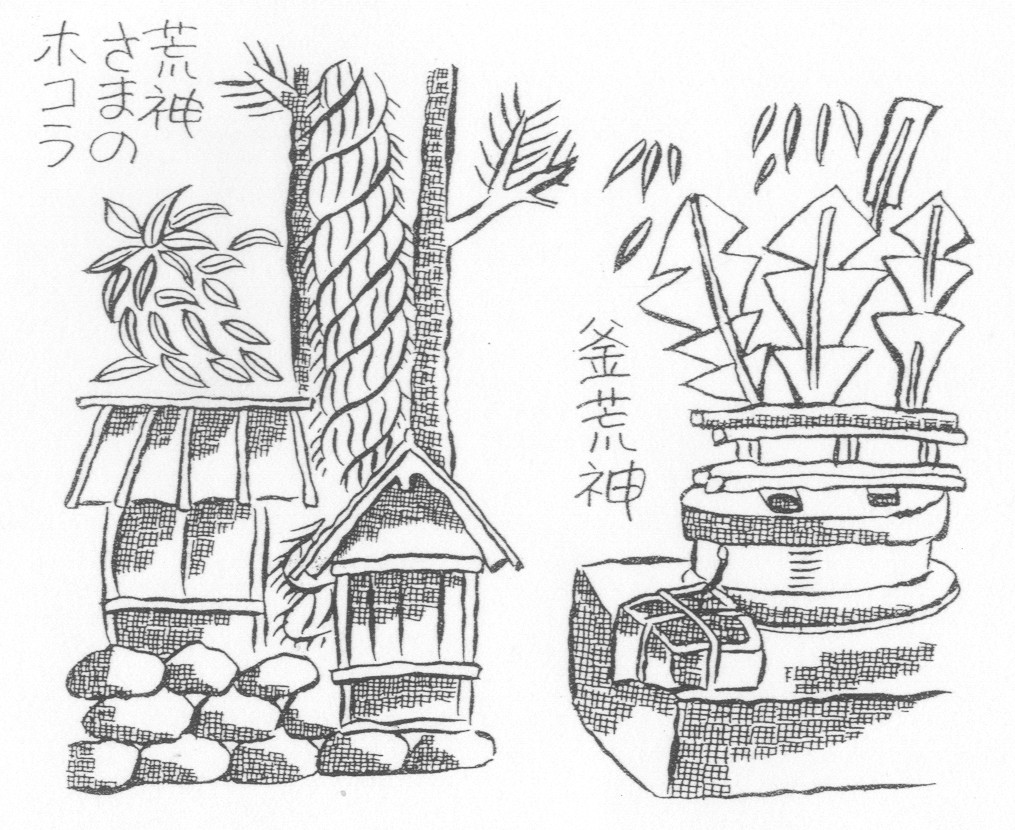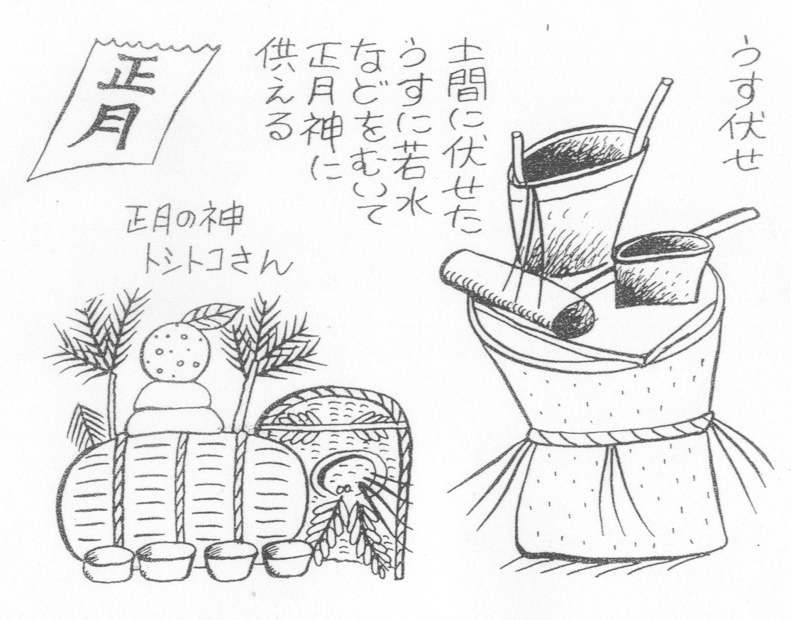 井戸神にお参りする。1月3日は井戸のつるべの縄をなう日などと