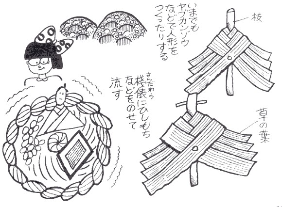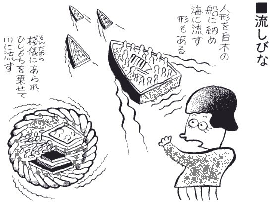 ▼流しびな 3月3日、ひなまつりの夕方などにブドウ位の大きさの顔の男び |