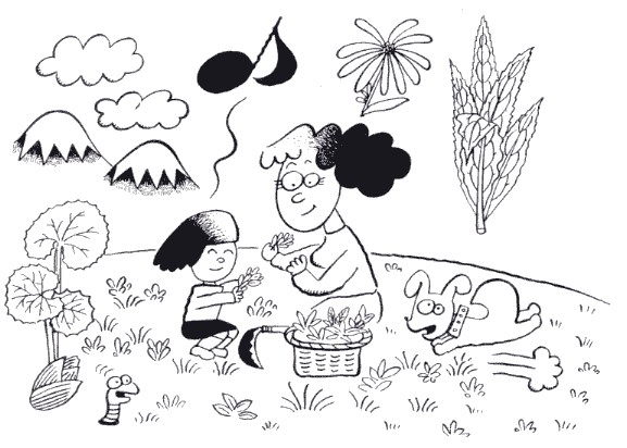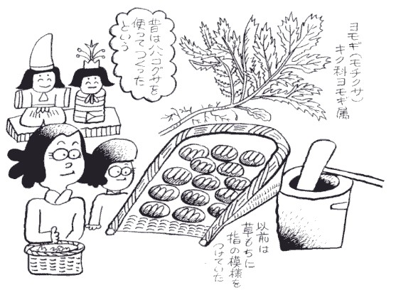 ▼草もち 田のアゼや日あたりのよい斜面で母子がヨモギつみをしていま |