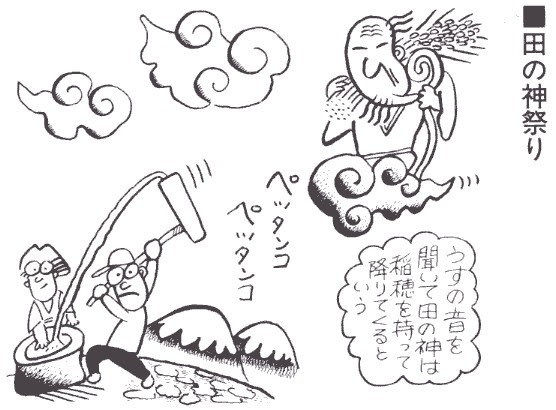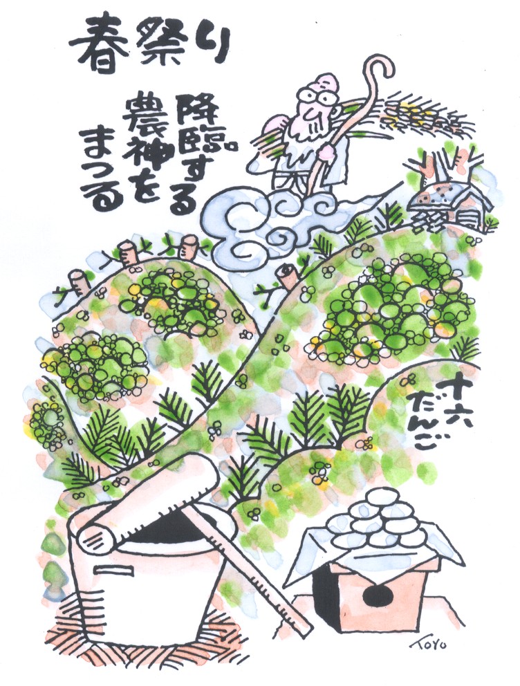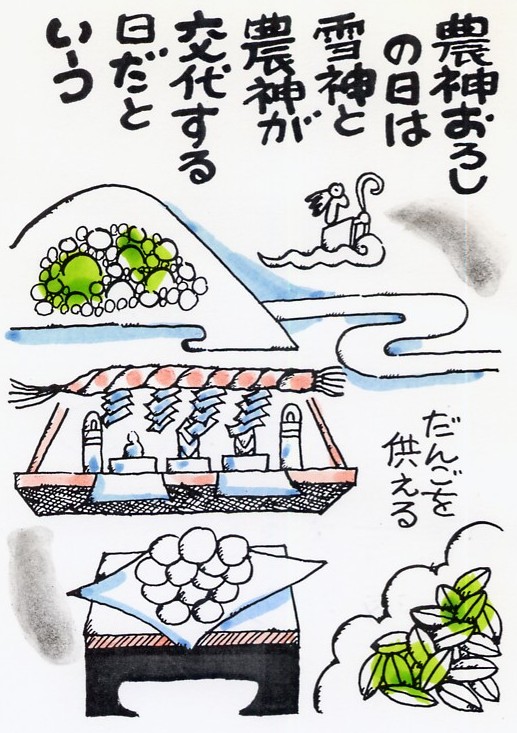 ▼農神下ろし 春、天や山から農神(山の神)さまが降りてきて、農作物の生長 |