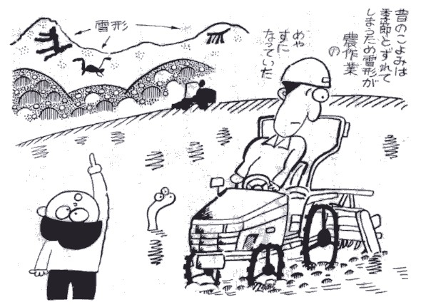 雪解け形(雪形)があらわれます。ふもとの農家は、この雪形の出