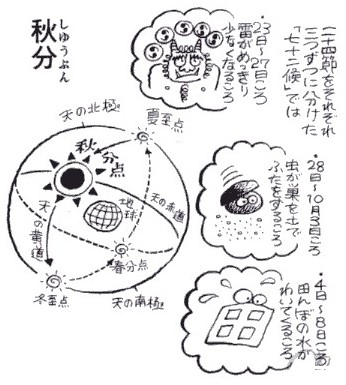 秋分は、太陽が真東から出て真西へ沈む日。秋分の分は「ひとし」