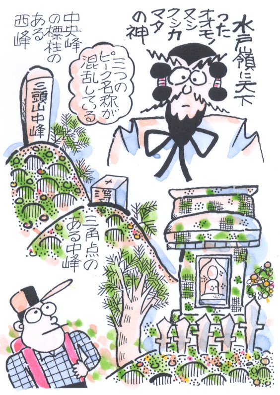 富山は形のよい双耳峰で、観音峰と呼ぶ南峰と、鞍部を隔てた広