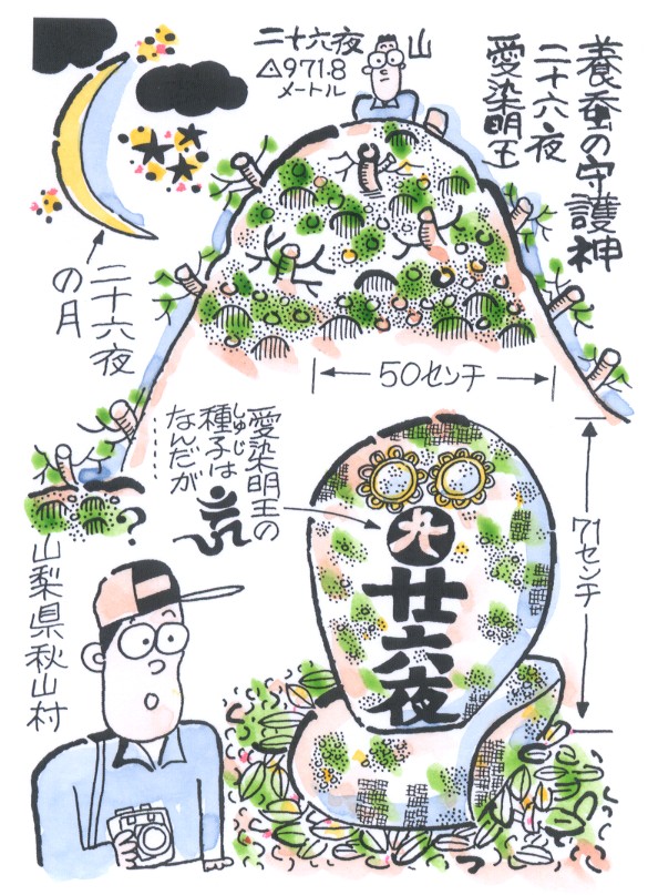 ■山梨県都留市・秋山二十六夜山の月待行事碑 かつて特定の月齢の夜、夕方から村人が集まり飲食をしながら月 −104− ―――――――――――――――――――――――― 二十六夜塔は、山頂へ3分ほど手前の広場にあり、東側が開けて