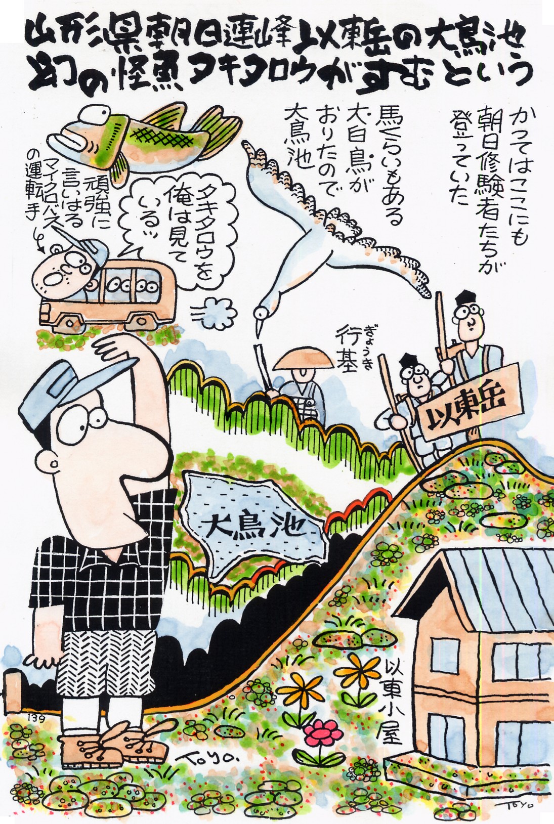朝日連峰以東岳北東の山上湖・大鳥池は怪魚タキタロウがすむとい