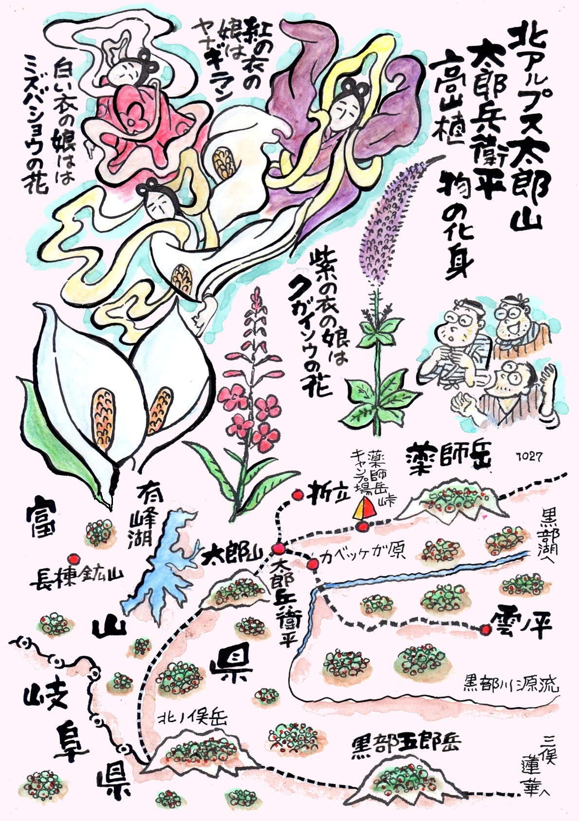 たちを集めて大宴会。その時、この平の高山植物の化身の美女に惑わさ