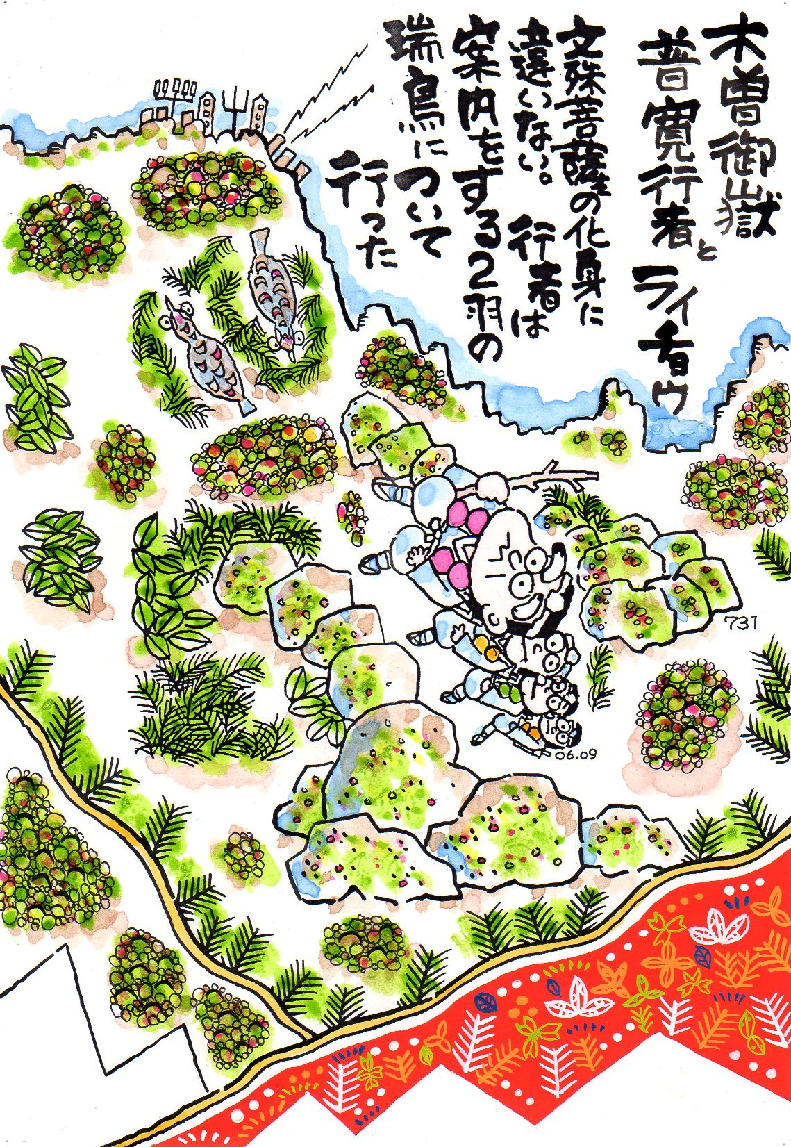 そこへひとつがいの瑞鳥があらわれ、一行を案内するかのように歩