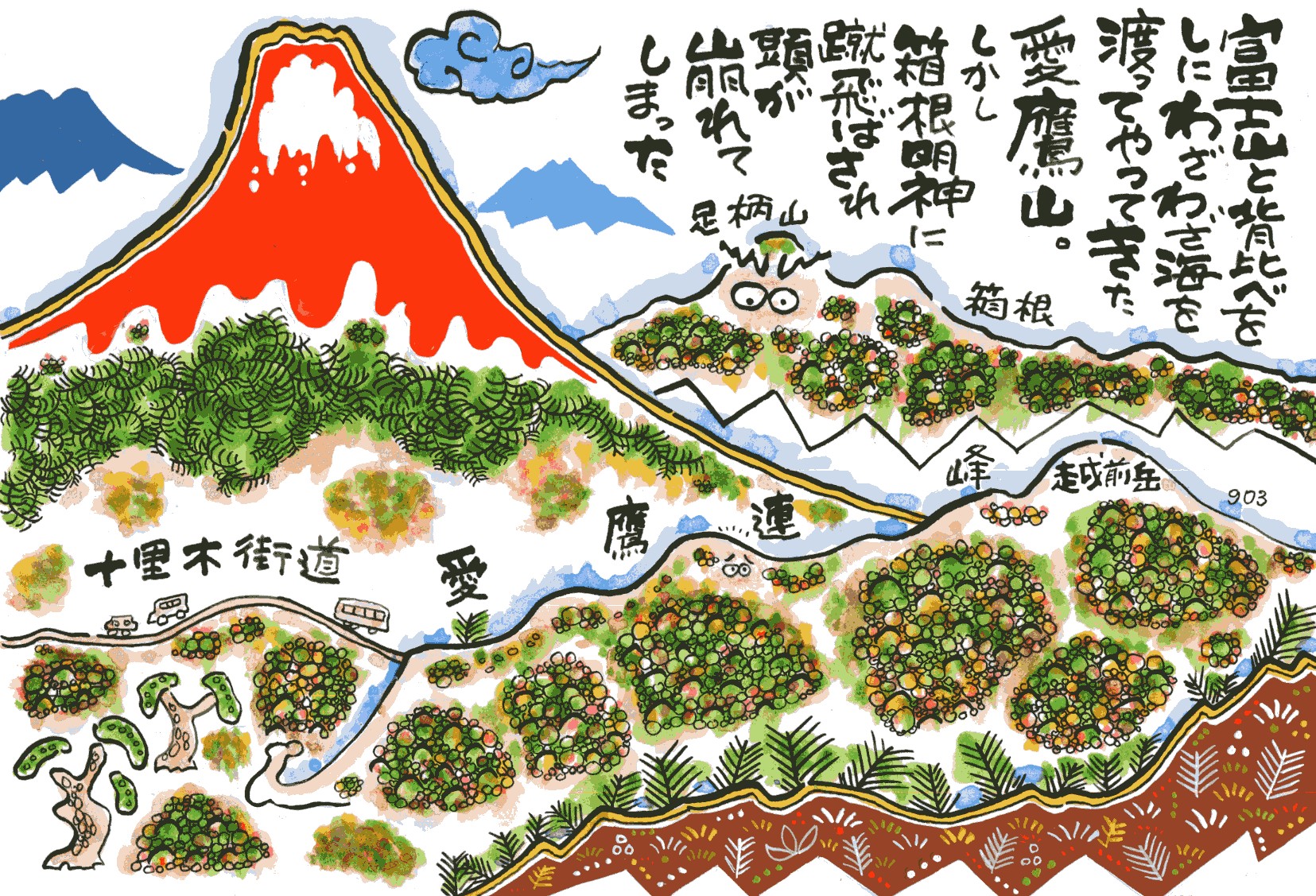 士山と勝負だなんて生意気な山だ」と箱根の足柄明神に蹴飛ばされ、
