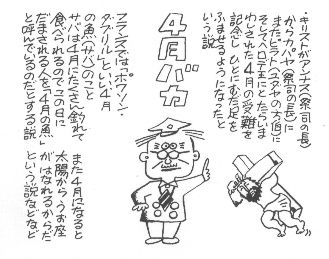 またフランスではこの日を「ポアソン・ダブリル」というそうで、その意味は4月の魚サバのことだという。サバは4月にたくさん(だまされて)釣れて、よく食べられところから、この日にだまされる人を「4月の魚」と呼ぶという説もあります。なかには4月になると太陽から「うお座」が離れるからというのや、4月には誘かいが多い月だからという説もあり、こちらがだまされそうになります。