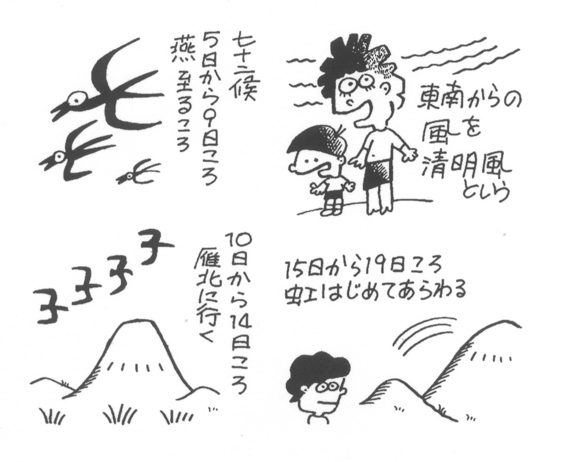 カレンダーやこよみの4月5日ころのところに清明(せいめい)という字が書かれています。これは二十四節気のひとつで、春先のいきいきした清らかなようすをいった「清浄明潔(せいじょうめいけつ)」という語を略したものだといわれています。
