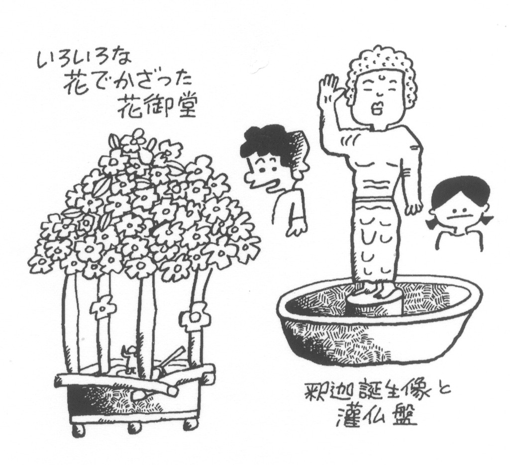 各地の寺院では境内に花御堂といういろいろな花で飾った小堂をつくり、これに銅でつくった誕生仏の像を浴仏盆の上に置きます。