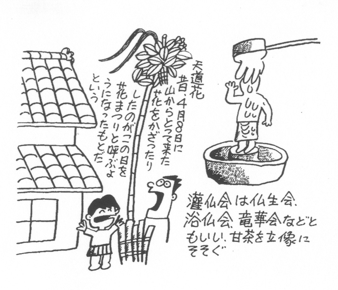 この日には各地でいろいろな行事が行われます。兵庫県では山からとってきた花を竹ざおの先につけて、庭に高く立てる「高花」とか「天道花」という風習があります。これがもとになり4月8日を花祭りというようになったとの説もあるとか。