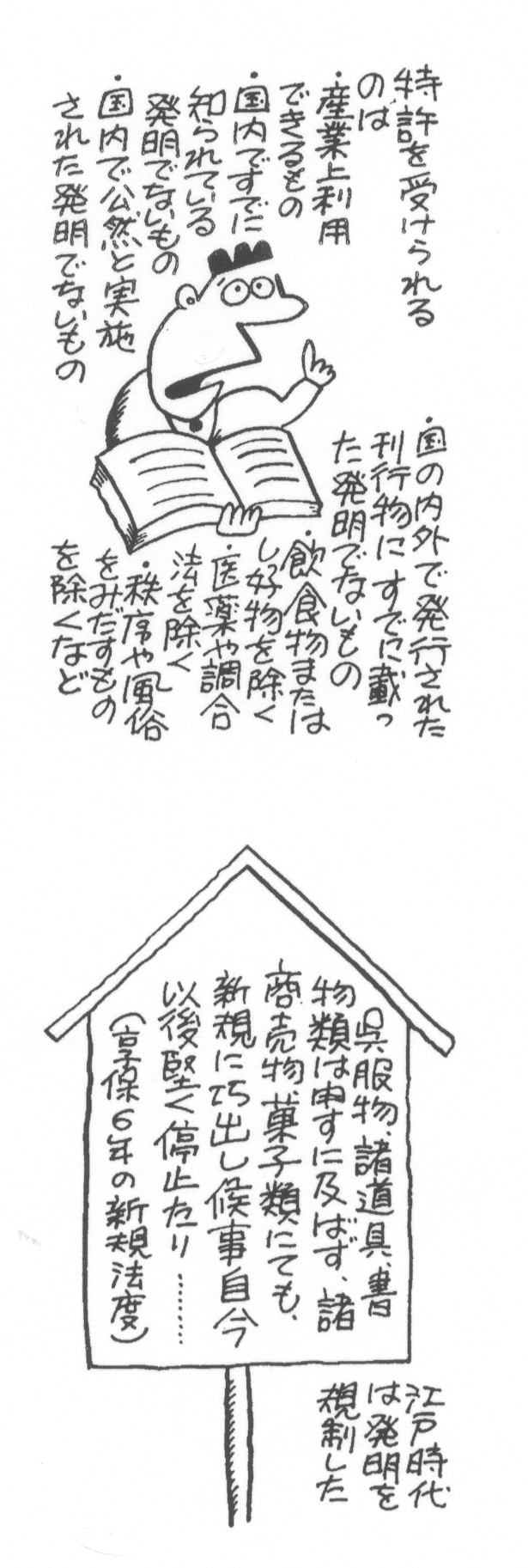 ちなみに、江戸時代にはもちろん発明や工夫が奨励されるようなことはなく、1721(享保6)年の「新規法度」のお触れのように、逆に発明はしないよう押さえる政策がとられました。その内容は「呉服物、諸道具、書物類は申すに及ばず、諸商売物、菓子類にても、新規に巧出し候事自今以後堅く停止たり……」というものでした。