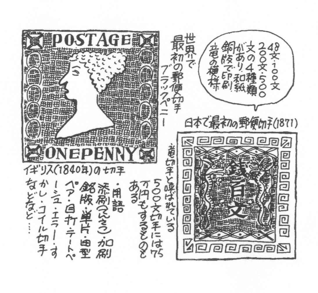 郵便切手がはじめて発行されたのは1840年イギリスのブラックペニーだという。当時の切手は目打ちがなく、いちいちはさみで切って使ったということです。日本では1871(明治4)年、ヨーロッパにならって新式郵便を実施、日本最初の48文、100文、200文、500文の4種類の和紙に銅販で印刷した竜の模様の切手で、「竜切手」と呼ばれているもの。このうち500文切手には75万円の子がつているものもあるそうです。