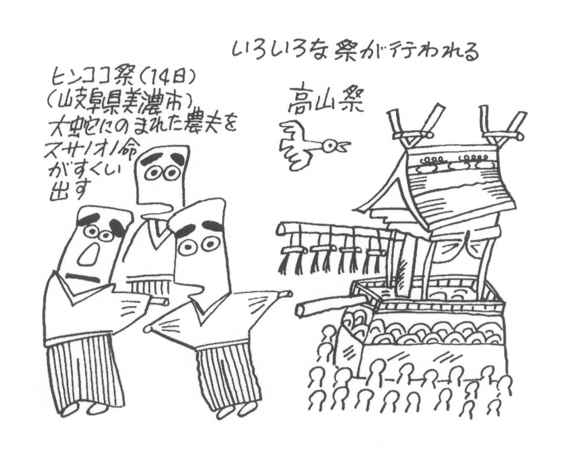 ▼春の高山祭(14、15日) 岐阜県高山市。しし舞いなどとともにみこしがねりあるき、各町内から12基の山車(だし)がくりだされます。屋台の上でのからくりもみごとです。