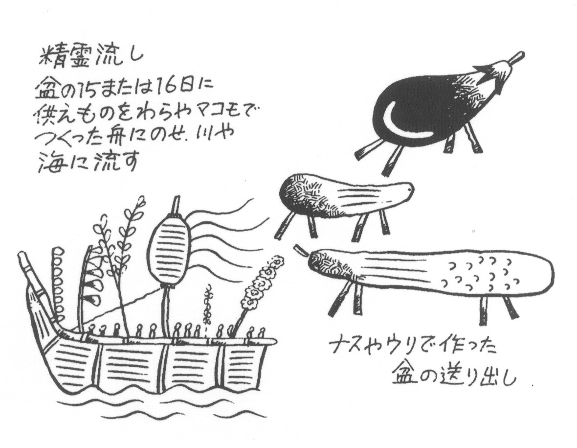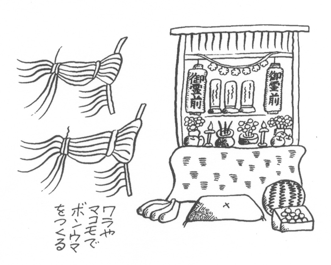 こうしてまつられた仏さまは、祭壇にまつられ、豆、イモ、そうめんやうどん、赤飯などを供えられます。お盆が終わると仏さまは、馬に乗り荷物を積んで帰るといわれ、ナスやキュウリ・わらなどで作った牛馬を供えます。