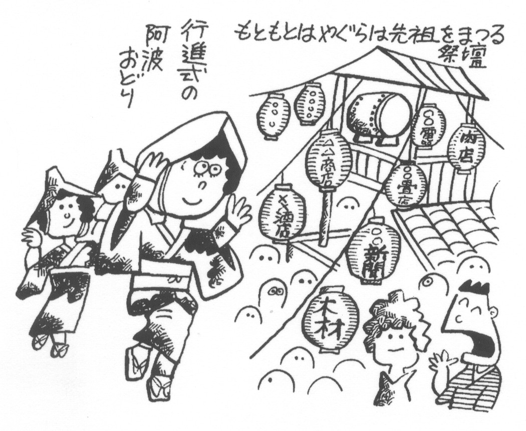 盆おどりには円舞式と行進式があり、円舞式は祭壇であるヤグラを中心におどります。また行進式はいくつもの組が町をねり歩きます。有名な四国の阿波おどりなど。これは先祖の霊をおどりながら送り出すほかに厄(やく)神を村境に追い出す意味もあるとのことです。