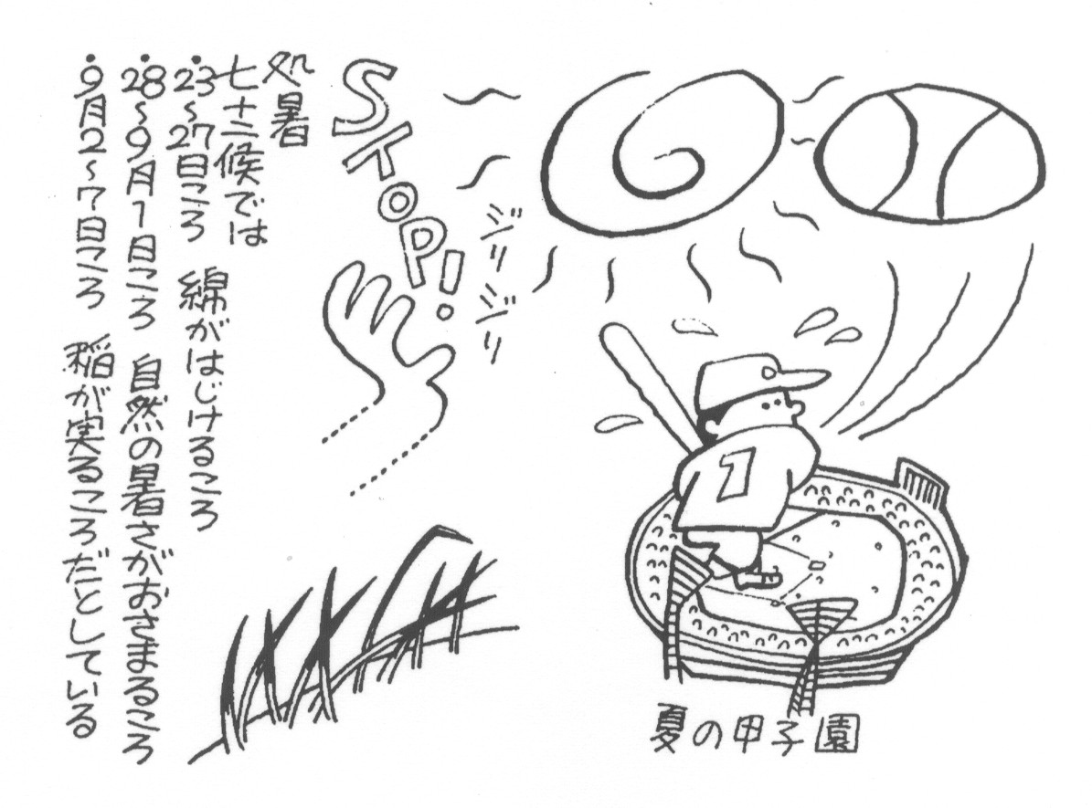 カレンダーの8月8日ころに立秋と書かれています。暦の上では、この日から秋に入ったということになり、いままで出していた暑中見舞いのはがきは「残暑見舞い」にかわります。しかし秋とは名ばかりで実際には1年中の最高気温があらわれる暑い日がつづきます。