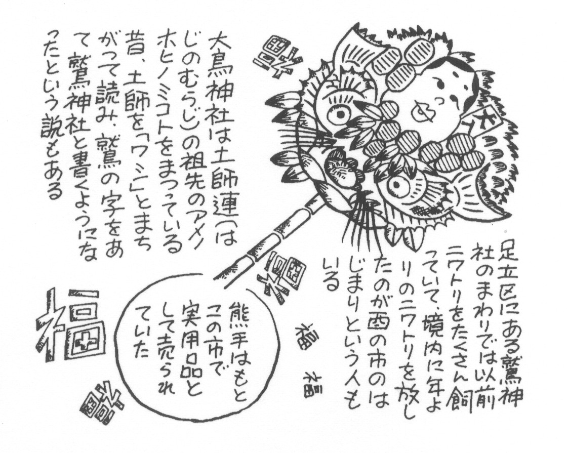 11月に3回酉の日のある年は火事の多い年ともいわれ、大熊手、おかめの面、入り船など豪華な縁起物を景気のよい売り声とともに売られます。熊手は福をかきこむという意味で、商売をする人たちでにぎわいます。しかし江戸時代末期はいまとちがって酉の市の熊手は水商売の人たち用のもので、かつては実用品としてこの市で売っていたそうです。