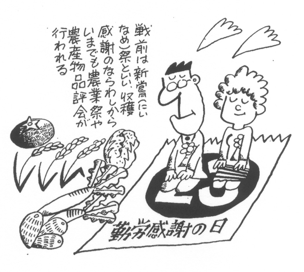 それまでは、天皇が収穫された新穀を食べてことしの収穫を感謝する儀式である「新嘗祭」という祭日でした。今回はその皇室儀礼中心の祝祭日を改め、平和憲法にのっとり自由と平和を求める国民がみんなで祝える日として「国民の祝日に関する法律」によって9つの祝日が定めらたものといいます。