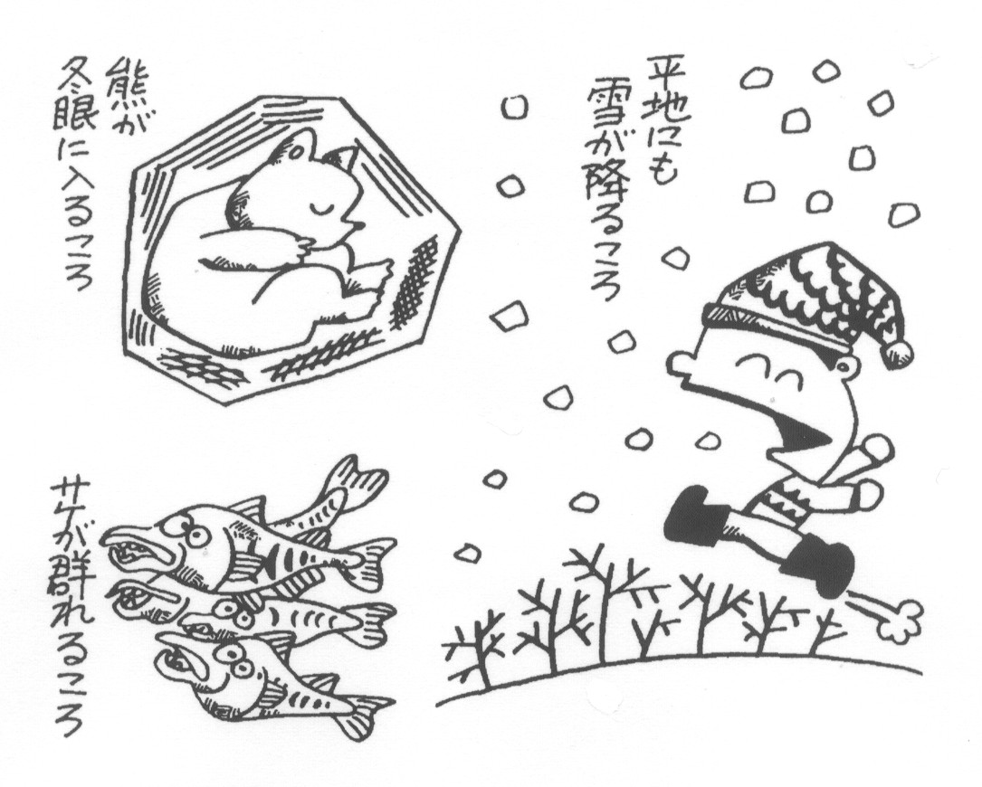 第六十一候は7日ころから11日ころで「閉塞して冬となる」天地が閉じてふさがり真冬になるころ、第六十二候は12日から17日ころで「熊穴にかくる」熊が穴に入って冬眠に入るころ、第六十三候は18日ころから21日ころで「鮭(さけ)群れる」ころとしています。