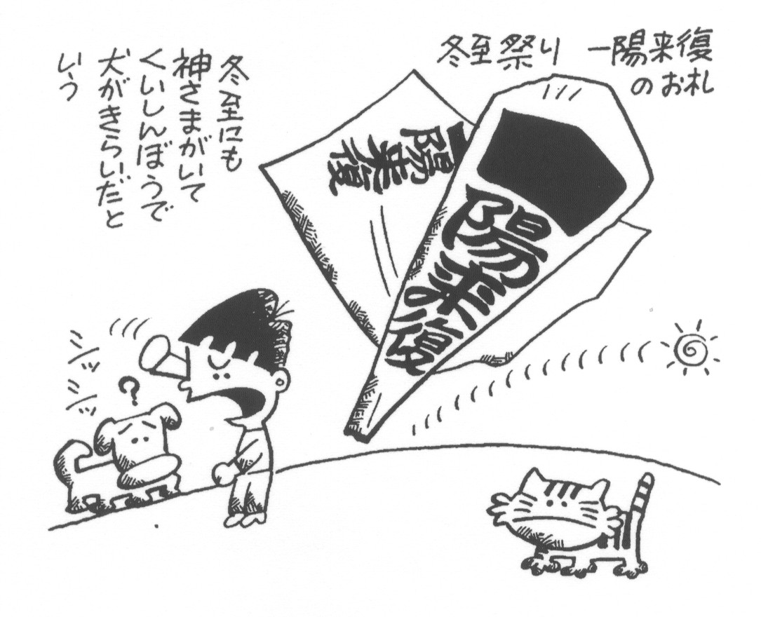 いまはあまりないようですが、かつて冬至には冬至粥(とうじがゆ)を食べる習慣がありました。年中行事に粥(かゆ)を食べる習俗は多く、正月の白粥、七草粥、1月15日のアズキ粥、麦まき後の穴ふさぎ粥、田植え前の苗取り粥、12月大師講のアズキ粥などがあります。