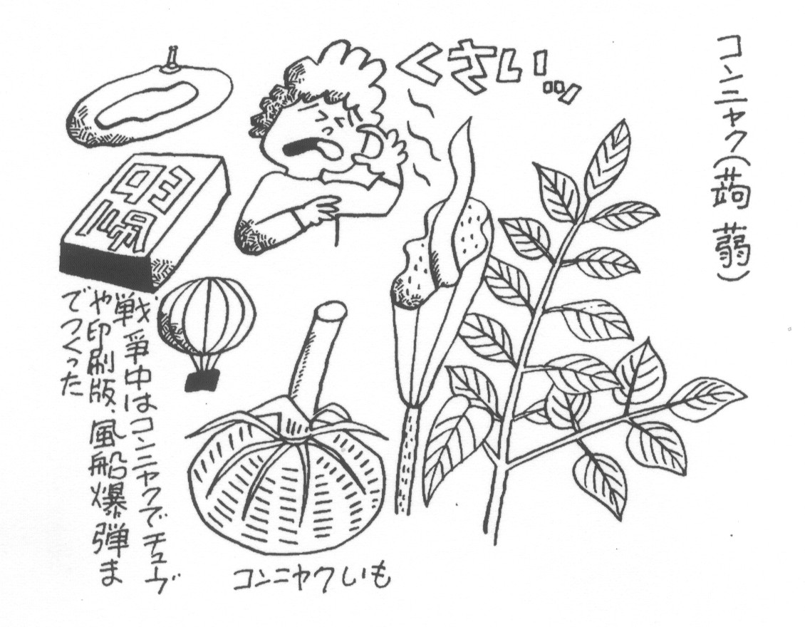 コンニャクは英語でもフランス語でもコンニャクで、これを食べているのはビルマの一部か日本だけといいます。コンニャクは春に古い球茎から太く長い茎を出して、その頂上にミズバショウのような構造の、暗紫色の気味悪く、ひどい悪臭を出す花が咲きます。食べるコンニャクは球茎を加工してつくります。