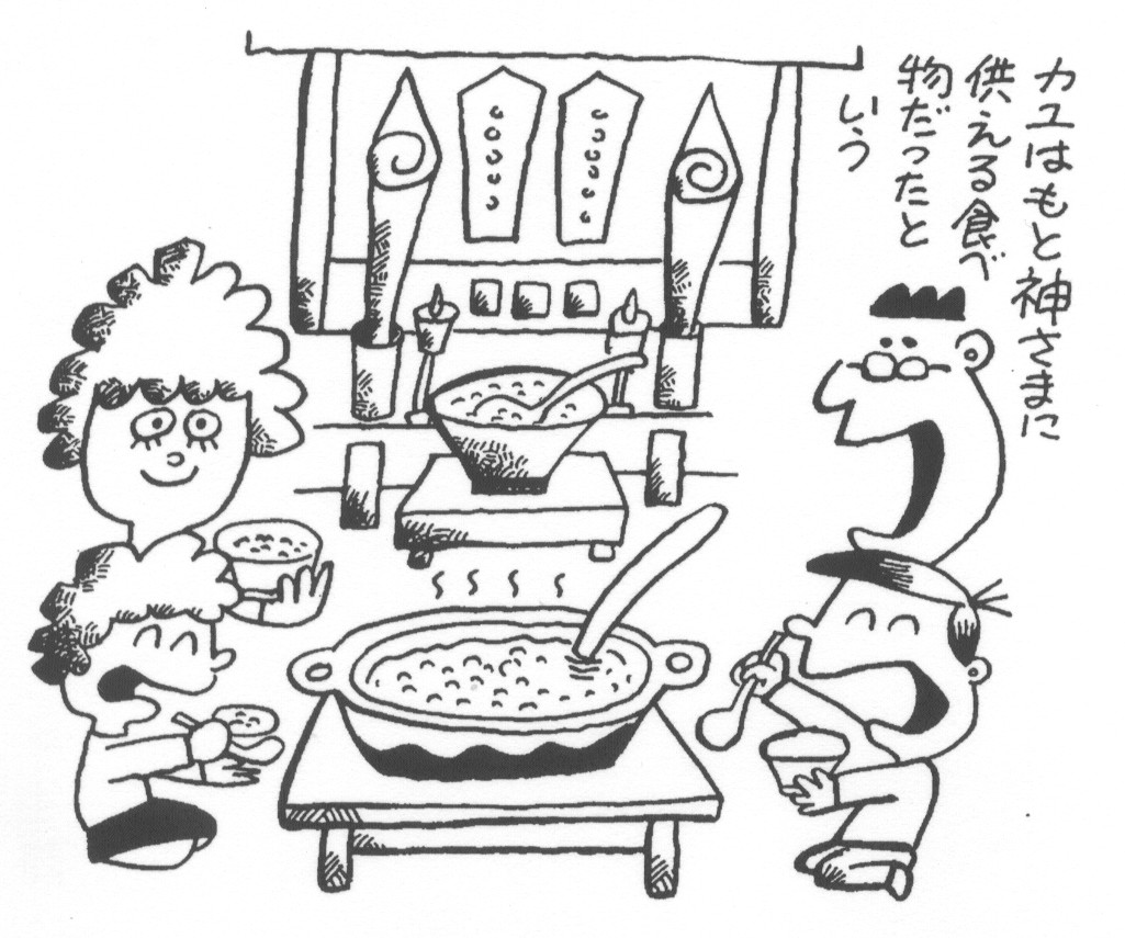 また粥占いという神事もあり、小正月にはお粥を使って農事を吉兆を占うものや、五穀といっしょに煮たカユの中に竹の筒を入れ、その中に入った五穀の比例で、その年の作物の出来を占ったりします。カユは濃湯(こゆ)のことだとも炊湯(かしぎゆ)の意味からきた語だともいわれています。