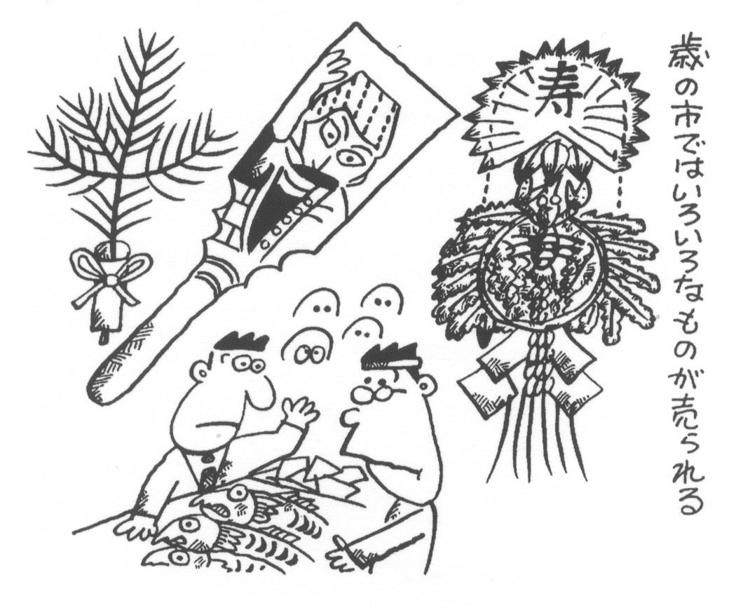 年の暮れになると「歳の市」が開かれます。歳の市は正月用の飾り物、破魔矢、雑貨縁起物、食べ物類を売る臨時の市で、おもに神社などの縁日に立ちます。