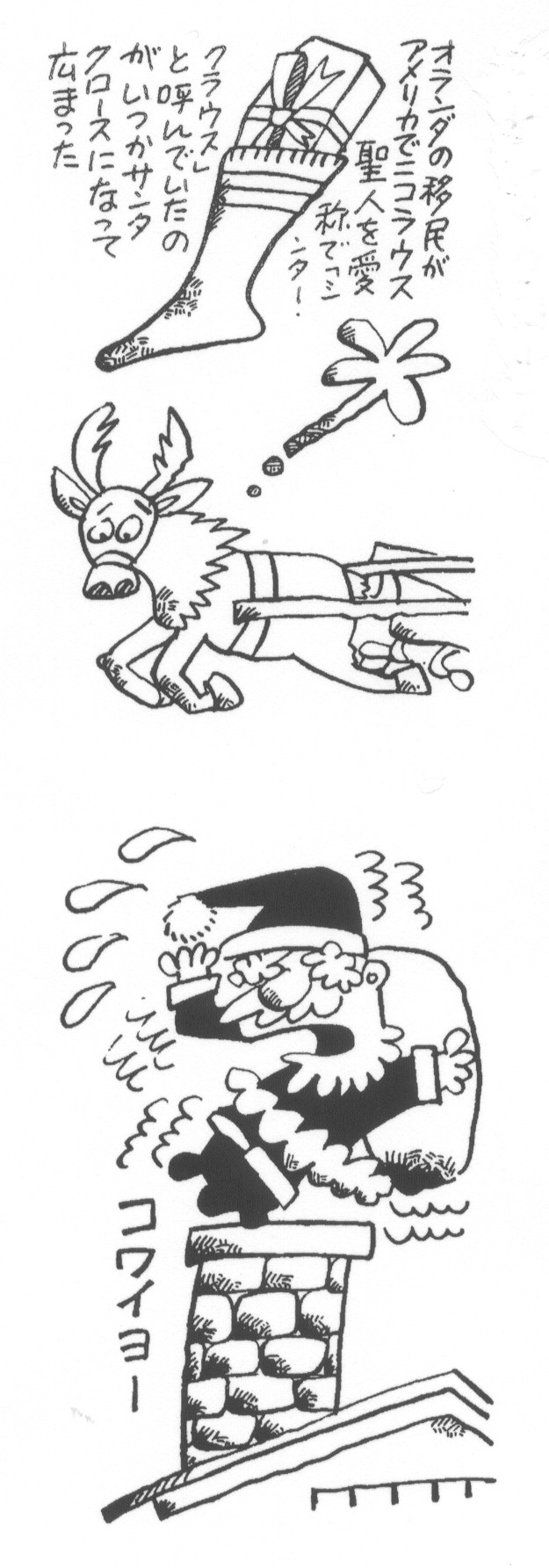 これに北極からの使者の北欧伝説が加わり、おもちゃなどのプレゼントを積んだ8頭のトナカイが引くソリが北極からやってくるという話に発展。これがオランダの移民を通じてアメリカに伝わり、クリスマスプレゼントの習慣と合わさります。やがていまのようなプレゼントを入れた袋を背負った、赤ずきん、赤い服、長ぐつをはいて老人ができあがっていったのだそうです。