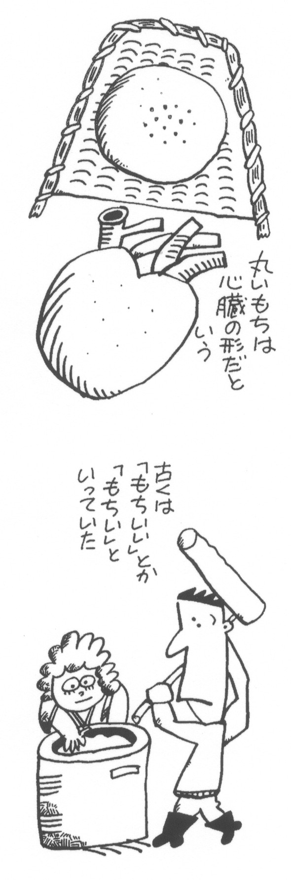 古くは「もちいい」とか「もちい」と呼ばれていたという。餅の形は鏡餅をはじめ多くは丸いものとされていますが、その丸い形はもともと心臓をかたどったものだという説もあります。