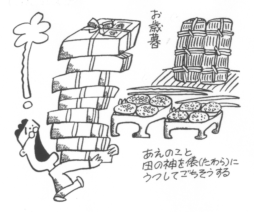 ▼あえのこと(5日) 石川県珠洲郡、凰至郡など。農家の主人が裃(かみしも)をつけて田の神を家に迎えてもてなします。また風呂に入れさせ、「熱うございますか。ぬるうございますか」などと話しかけます。