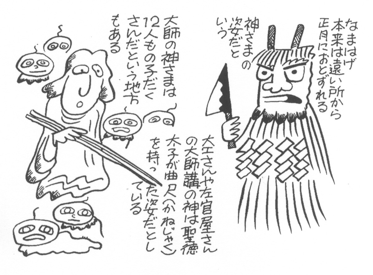 ▼大師講(だいしこう) 旧暦11月23日の夜から翌日へかけての祭。この日は弘法大師または元法大師が訪れてくる日だといい、「あとかくしの雪」とか「でんぼかくしの雪」といって、必ず雪がふると信じられていました。