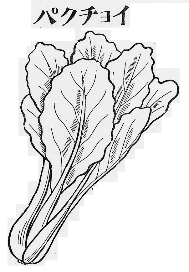 | (10)パクチョイ(春5月) これは中国野菜のひとつで農林水産省の統一名称。中国では白 菜(パイツアイ)のなかで、結球する白菜を大白菜(ダアパイツ ア)、結球しないものを小白菜(シャオパイツアイ)と呼んでいま す。 小白菜には葉柄(茎)が白いものと青いものがあり、白い白梗 菜(バイゲンツアイ)を日本では以前は白茎パクチョイと呼んで いたが「パクチョイ」に統一。また茎の青い小白菜も同様に、青 茎パクチョイといっていたが「チンゲンサイ」と呼ぶようにされ ました。