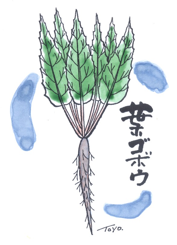| (11)葉ゴボウ(春5月) 若い根と葉(葉柄)を食べるためのゴボウの1品種。福井県大 野地方原産の「越前白茎」という品種が用いられています。関西 地方で多く栽培され、「若ゴボウ」とも呼んでいます。 葉柄がやわらかく長く、茎葉が多い。根は10センチくらいと 短く、枝根が多く出ます。店頭では、細く長い葉柄に葉もついて 売られています。福井県で採種したものを取り寄せて各地で栽培。 大阪や八尾地方では「八尾ゴボウ」とか、細長い葉が矢のように 見えるので「矢ゴボウ」などとも呼んでいるという。 ゴボウの葉は、古くから食べられていたらしく、江戸時代の初 期・元禄八(一六九五)年の本『本朝食鑑』(平野必大著)には 「苗ヲ剪リテ蔬ト作ス」と葉ゴボウのことを記録しています。ま た『農業全書』(宮崎安貞著)には「牛蒡ヲウヘオキ、茎葉ノワ カキヲキリテ菜ニ用ユル事韮ノゴトシ」と出ています。