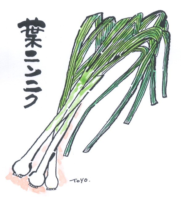 | (13)葉ニンニク(春5月) 文字通り葉のニンニクで、1片のニンニクから芽がでて、葉が 伸びたところを収穫したもの。これは農林水産省の統一名称で、 中国名は蒜苗(ソワンミヤオ)で、とくに濃緑色のものを青蒜苗 (チンソワンミヤオ)と呼ぶそうです。 ふつう、香港種など中国産の南方系の葉身や葉鞘の柔らかい品 種を使用しまが、国内でも日本種の球ニンニクで栽培されていま す。ただこの場合、葉が垂れやすいので農家の人は植えつけ密度 を広くするのだそうです。 ニンニクの葉なので、きざむとニンニクの持っている物質と同 じ含硫化合物のアリインが空気に触れてアリシンとかいうものが 生じ、独特の臭さがでてきます。 しかし、そのにおいにニンニクのような強さがないため、ネギ、 ニラと同じ感覚で扱われ肉、魚の臭みを消すのに利用されます。 また、白い部分は、薄切りにして生食できます。