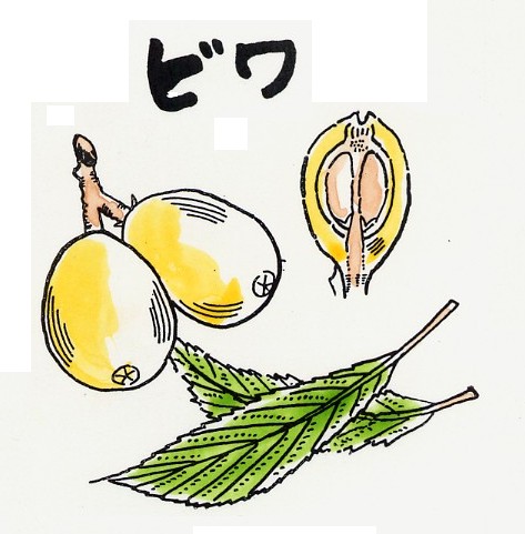 | (14)ビワ(春5月) ビワは果実の形が楽器の琵琶に似ているからついた名とも、葉 の形が似ているからともいわれています。中国や日本に原生して いる果樹で庭木、さし花用にも栽培されいます。 中国では、5世紀ごろから栽培され、日本でも平安時代の「三 代実録」(901年)に、「元慶7年(883)5月10日、豊 楽殿の御宴でピワを下賜された」との記録があり『延喜式』(9 27)や「本草和名」(918)にも書かれています。 江戸・天保年間(1830〜44)、長崎県茂木町の三浦シオ が清国船からビワの種子を貰い、まいたところ在来種とちがって 果実が大きく、品質ともによいビワがなった。これが同地特産の 茂木ビワのはじめという。 また明治初期の植物学者田中芳男は、明治12年(1879) 長崎で食べたビワが大きくて味がよいのに感心、種子を東京本郷 の自宅にまいたものが8〜9年結実、田中ビワと呼び、いまでは 千葉県の特産になっています。 ビワは生食にするほか、かんづめ、ぴんづめに加工され、種子 は「杏仁(きょうにん)の代用に、材は強いので装飾用、つえ、 木刀などに利用されます。年末近くに大きな円錐花穂をつけ、果 実は翌年の初夏に熟します。 ビワは種子が大きいため、種なしビワが出来ないものかと、大 正の初期に財閥の三井家が当時のお金数千円を投じて研究したが 成功しなかったという。しかし、昔の書物・『廣志』(中国・5 02〜556年)や、日本の「草木栽培法」(1876年)に、 種なしビワの記録があるがはっきりしません。しかし現在は種な しのものもできて流通しています。 品種に田中ビワ、茂木ビワ、土肥ビワ(静岡県)、楠ビワ(高知 県)、津雲、戸越、瑞穂などがあります。 ビワは生食にするほか、缶詰め、びん詰めに加工。種子は「杏 仁」の代用に、また、木自信は強いので装飾用、つえ、木刀など に利用されます。