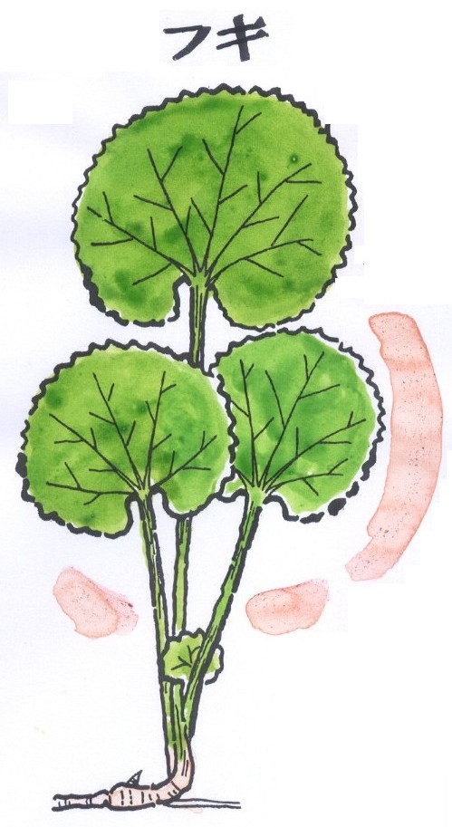 | (15)フキ(春5月) フキの名は「吹く」という言葉に関係があります。吹くといっ てもホラの方ではありません。山の道ばたに一面に咲いたフキノ トウ。その花から白い冠毛の果実が吹き散るさまは、まさに山吹 雪。そのヤマブキがつまってフキになったのだそうです。 平安時代の「本草和名」という本に、「和名也末布々岐(やまふ ぶき)、一名於保波(おほば)」と出ています。也末布々岐は山吹雪、 於保波は大葉のことです。 その他、フキの葉は大きくやわらかい。だから汚れを拭くのに 都合がよいとて、拭くが拭きになり、やがてフキという名前にさ れた。それに「富貴」の次をあてて楽しむというから昔の人たち は優雅であります。 フキは北へ行くほど大型になり、「尾張ダイコン、秋田ブキ」と いうことわざがあるほど秋田あたりでは大きくなり、県の花に指 定され、♪ハアー秋田の国では雨が降ってもかさな土いらぬ、手 ごろのフキの葉サラリとさいかけ、サッサと出て行くわい……と 秋田音頭に歌われてもいます。