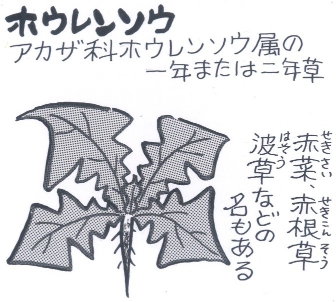 | (18)ホウレンソウ(春5月) 筋骨リュウリュウのひげづら、大男・ブルートに言い寄られる カレンなる乙女オリーブ。「たすけてー」の声にオットリ刀でかけ つけるセーラーマン。ポパイとくればどうしてもホウレンソウの 話になるのであります。 ホウレンソウは、ビタミンやミネラルが豊富で緑色野菜の代表。 ビタミンCはミカンの2倍、ビタミンAもニンジンの2倍、カロ チン、カルシウム鉄分もたっぷり。ポパイでなくとも筋肉ググー ンとなるような気がします。 ついでながらポパイはもともとホウレンソウのカンづめ会社の 宣伝用だとか、またアメリカの菜食主義普及に利用されたとかさ れないとかの話もあります。 ま、ポパイのはなしは置いとくとして、ホウレンソウの話。凰 連草、法連草、波斯草とも書きますが、ホウレンソウの語源は漢 名の菠稜。唐音で「ホウレン」、渡来先の国名でイランのことらし い。 原産はコーカサスからイランにかけての西アジア。いまでもソ 連のアルメニア共和国からイランにかけてホウレンソウが自生し ているという。
