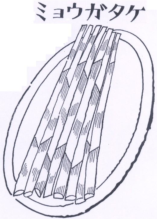 | (19)ミョウガタケ(春5月) 突然ですが、お釈迦様の弟子に般特(はんどく)という物忘れ の名人がおりました。何しろ自分の名前も忘れてしまう達人です。 あわれに思ったお釈迦さまは、彼の名前を札に書いて首にかけて やりましたが、それもかけることさえ忘れるしまつ。 この名人の死後、その墓から名も知らぬ草が生えてきた。そこ で名札を荷った般特ということで、草かんむりをつけ「茗荷(みょ うが)」とその草に名づけたといいます。 そんなことから、ミョウガを食べると物忘れするというように なり、「茗荷宿」という落語にまでとりあげられます。 宿に泊まった客から、大金入りの胴巻きをあずかった主人夫婦。 しきりにミョウガ料理を食べさせます。しかし客は胴巻きは忘れ ず、宿銭の方を忘れて出発するというストーリーです。 はなし変わって、中国の陳寿が3世紀の日本のことを書いた、 ご存知「魏志倭人伝」。日本にはショウガ、ミョウガがあるがまだ 食べ方を知らないと出てきます。 しかし、ショウガやミョウガは、中国から伝来したしたもの。 味つけするのを知っているからこそ、古代から栽培しているので、 この記述はまちがいだろうと、図鑑にありました。ショウガナイ なあ。