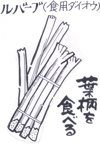 | (20)ルバーブ(食用ダイオウ)(春5月) ルバーブ。日本名ショクヨウダイオウ。薬用植物ダイオウの仲 間だという。明治の初め、西洋野菜として導入しました。強い酸 味と渋みが日本人の好みに合わず普及しませんでした。需要が増 えだしたのは最近になってから。 紅色をおびた葉柄は酸味・香気があり、皮をむいて生のままサ ラダにしたり、煮たものをパイ、プリン、ケーキの原料に、また ソース、ゼリー、ジャムにしたりします。 ルバ−ブは、シベリア南部原産。ギリシア・ローマでは紀元前 から薬用と食用に栽培されていたという。16世紀にイギリスに 導入され、アメリカヘは18世紀、ドイツには19世紀に渡った という。中国では、紀元前2700年ころから、漢方薬として、 利用されていたというから驚きます。