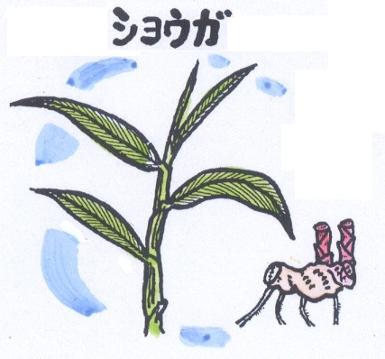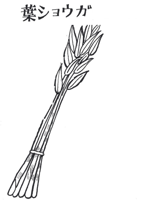 | (15)葉ショウガ(夏6月) ショウガの記録は古く『古事記』や『日本書紀』にも登場して います。漢方でも古くから利用され、新鮮な根茎を生姜(しょう きょう)といい、健胃、利尿、感冒、咳や嘔吐(おうと)をしず めるのに用いられてきました。 また乾燥した根茎は乾姜(かんきょう)と呼ぼれ、非常に辛く 体の冷え、下痢、腹痛をなおし、新陳代謝を高めるとされていま す。普通の家庭でも風邪の時にショウガ湯を作って飲ませます。 ショウガは根茎の塊茎の大きさで、大ショウガ、中ショウガ、 小ショウガの3群に分けられます。大は漬物、砂糖漬け、菓子用。 中ショウガは葉ショウガや漬物に。小ショウガは、芽ショウガ として料理のつまみに、葉ショウガ用としても栽培されます。 また利用面からは、芽ショウガ、葉ショウガ、根ショウガに分 けます。芽ショウガは光をさえぎって軟化栽培したもの。葉ショ ウガは、根茎から伸びた新しい地下茎を生食に。根ショウガは、 秋に収穫し貯蔵して随時出荷するもので薬味や香辛料に使われま す。