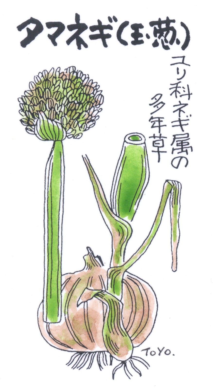 | (10)タマネギ(夏6月) タマネギは球葱。文字どおり球のネギ。ネギと同じように「葷 酒」の仲間。山門には入れません。 しかし、紀元前5000年もの昔、カルデヤ国ではタマネギを 神の「お守り」にしていたといい、前4000年前、エジプトで は神聖なものとして、神壇に供えたというから、神サマはそうお 嫌いではなかったようです。 タマネギは、球葱、葱頭、洋葱とも書き、原産はアソコだココ だと説があるが、みんなひっくるめて西アジアあたりとなってい ます。 日本では江戸時代、長崎の出島でオランダ人が栽培したといい ますが、まあそれはおいといて、日本人が栽培をはじめたのは明 治になってから。北海道札幌村で栽培した記録がある。