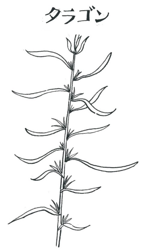 | (11)タラゴン(エスタラゴン)(夏6月) タラゴンは葉をハーブとして利用するキク科ヨモギ属の多年草。 日本のヨモギと同じ属ですが、香りはその比ではないという。鶏 肉料理や野鳥料理、エスカルゴの料理のつま(ガーニッシュ)な どのフランス料理に欠かせません。 また、タラゴンの生の葉や乾燥品をワイン酢に浸してつくるタ ラゴン酢(エスタラゴン・オウ・ヴィネーグル)は、サラダのド レッシング用として使われます。また生のままの葉をきざんで料 理に添えたりします。 原産は南ヨーロッパからシベリア。日本へは1915(大正4) 年に渡来したが、夏の暑さに弱く日本では栽培しにくいため、栽 培はまだわずかだという。 タラゴンは、草の高さ0.6から1m。ヨモギに似ていますが、 全体に無毛。葉はヨモギとちがって細く、根出葉は三片に深く裂 けています。ふつうは開花せず、夏に緑白色の小さな花をつけて も、種子はまれにしかできず、繁殖は地下茎やさし芽でします。 冬になると地上部は枯れてしまいますが、温室で育てれば冬で もよく茂って年中若葉がとれます。刈り取った葉は、手早く陰干 しにして密栓して保存しますが、香りは生葉の方がよい。 栽培種にはフランス種タラゴンと、ロシア種タラゴンの2種類 があります。ロシア種タラゴンは、フランス種にくらべて香りが 弱い。フランス種は、エストラゴン(小さな竜の意味)と呼ばれ、 「本物のタラゴン」とされています。