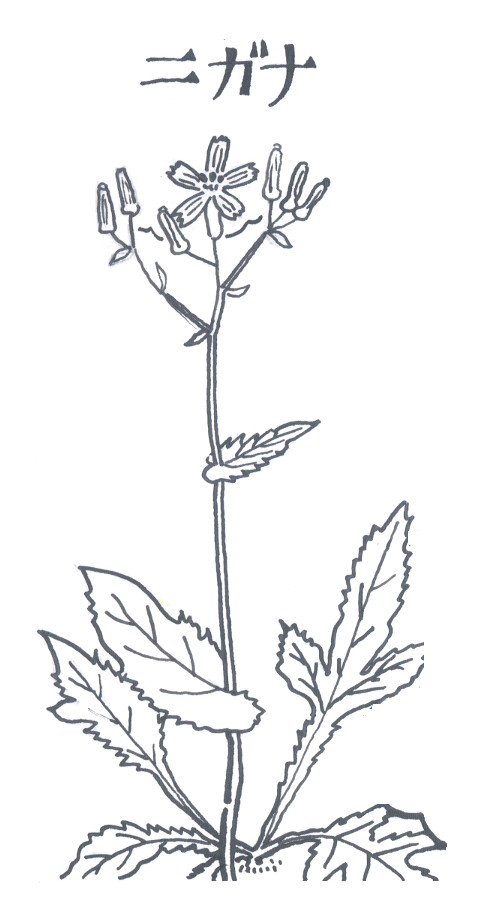 | (12)ニガナ(夏6月) 全国の低山や野原などに普通にみられる野草ニガナ。若葉と根 を食用にします。葉や茎に白い乳液があり、かむと苦いのでニガ ナの名があります。沖縄では昔から栽培され、料理に利用されて きたという。フナといっしょに汁物、あえ物、あお汁に、またス ミイカと豚肉、ニガナを煮込んでイカのすみを入れた'"白イカの お汁"は郷土料理になっています。 茎は細く、高さ30センチくらい。根生葉は細長く不規則に切れ 込みがあり、ヘリにギザギザがあります。茎葉は耳状で茎の別れ ぎわで、それを抱くように生えています。 5〜7月ころ、茎の先端で枝分かれして、集散花序に黄色、と きには白い花頭をつけます。ハナニガナ、シロバナニガナ、タカ ネニガナなど、みなその仲間です。 ・キク科ニガナ属の多年草