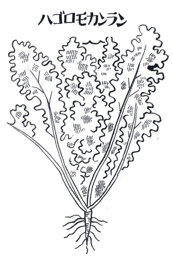| (14)ハゴロモカンラン(夏6月) カンランというからキャベツの一種になっていますが、どうし てどうして、いまのキャベツの原形とされる由緒ある野菜。 ケ−ルとか緑葉カンランともいい、結球せず葉が長く大きく、 縁に欠刻が多く葉身が縮れるという、まさに「羽衣」にふさわし い形。 ギリシャ時代から栽培されてきたといい、茎の立つ型がありま す。明治初年にアメリカから導入。性質はキャベツに似ていて2 年生で、春にとう立ちし、5月下旬に開花します。 冬から春にかけ次々と葉をかきとってサラダや煮物、また青汁 用に使います。 ・アブラナ科アブラナ属の2年生作物
